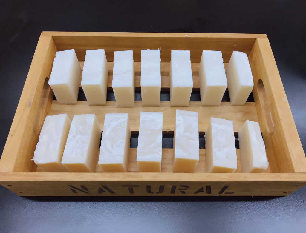 石けんを作る際、オイルの他に精製水を混合しますが、私たちは、「美人の湯」として有名な榊原温泉水を使用しています。精製水で作ったものと比べて、なめらかな使い心地の石けんに仕上がります。その他に使用する素材は天然成分だけのため、石けんとして使用できるまで、じっくり4週間の熟成をさせています。